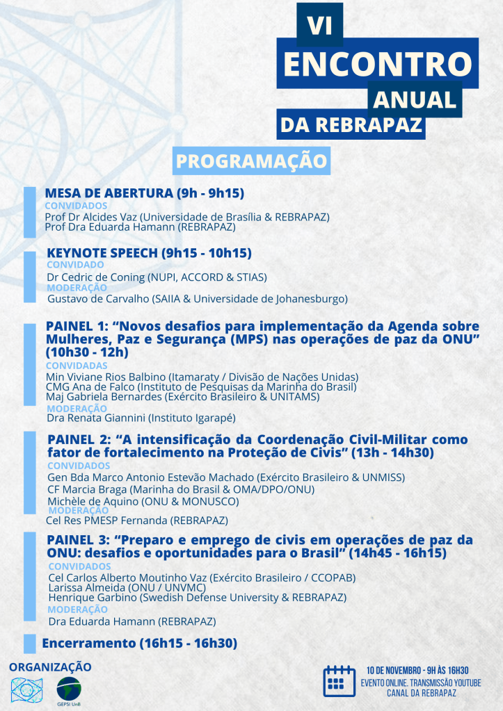 Para debater essas e outras ideias relacionadas, situadas nos níveis estrutural, operacional e tático, a Rede Brasileira de Pesquisa sobre Operações de Paz (REBRAPAZ) convida a todos para participar de seu VI Encontro Anual, a ser realizado de maneira online, no dia 10 NOV 2022, das 9h às 17h.