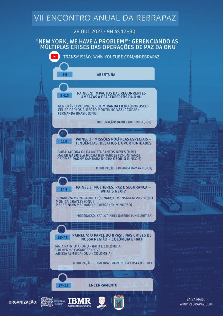 Para debater essas e outras ideias relacionadas, situadas nos níveis estrutural, operacional e tático, a Rede Brasileira sobre Operações de Paz (REBRAPAZ) convida a todos para o seu VII Encontro Anual, a ser realizado de maneira híbrida, em 26 de outubro de 2023, das 9h às 17h, no Centro Universitário IBMR, no Rio de Janeiro (campus Barra da Tijuca), com transmissão ao vivo pelo canal da REBRAPAZ no YouTube (@rebrapaz).